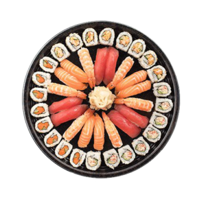 Two pieces of each: tuna, yellowtail and salmon; served with one piece each: whitefish, shrimp, octopus and sweet egg
